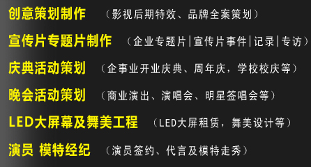 智慧力——創作團隊   創意總監——創意來自生活,高于生活    美術指導——身手敏捷,思想敏銳,具有獨特的美術嗅覺   資深策劃——思維縝密而又膽識過人,常常給人意外之喜   經典影視.品牌傳播,采用國際化的Team作業模式——
